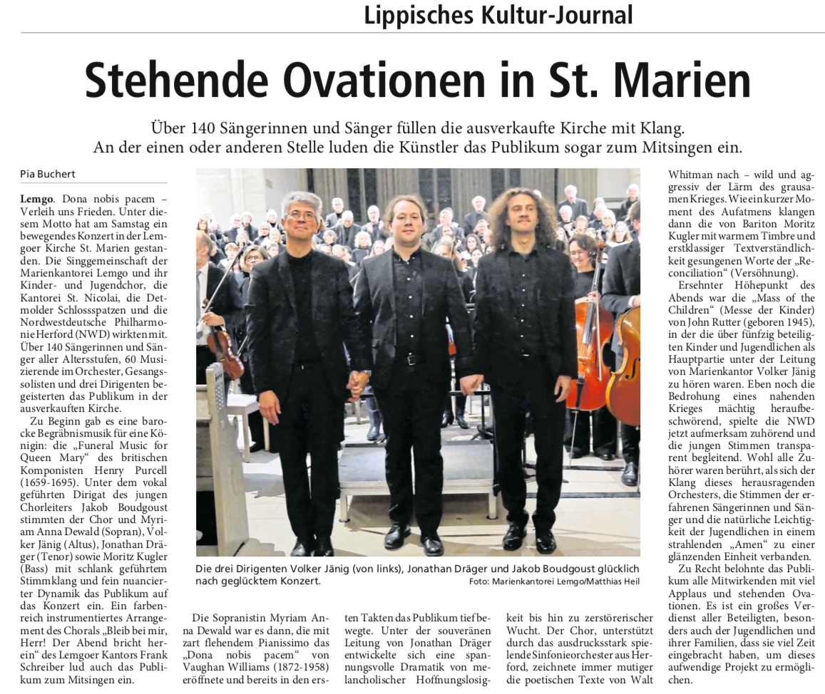 Mitwirkende sind Myriam Anna Dewald (Sopran), Moritz Kugler (Bass), die Kantorei St. Nicolai, die Singgemeinschaft, der Jugendchor und die Große Singschule der MarienKantorei sowie die Detmolder Schloss-Spatzen unter der Leitung von Christiane Schmidt.