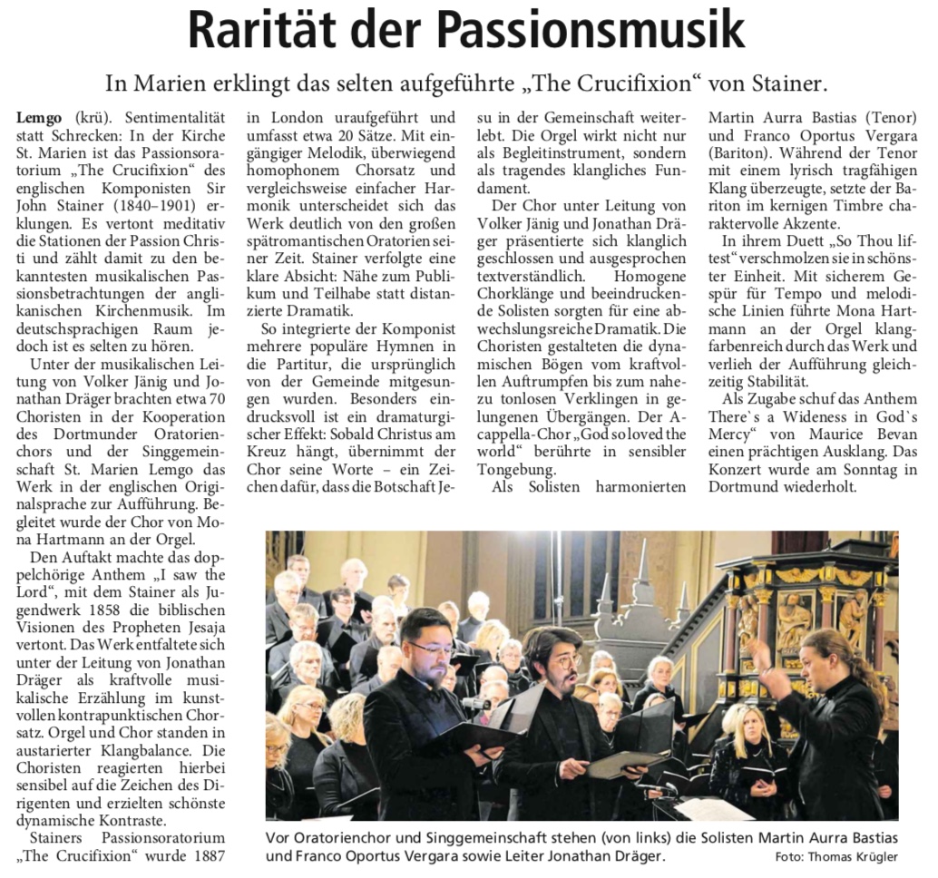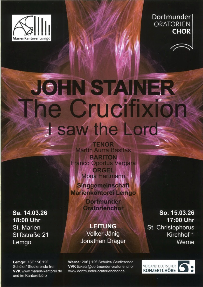 In der Kirche St. Marien in Lemgo erwartet die Besucherinnen und Besucher am Samstag, den 14. März 2026, um 18:00 Uhr ein besonderes musikalisches Ereignis: Zur Aufführung kommt das Passionsoratorium The Crucifixion des englischen Komponisten John Stainer (1840–1901).