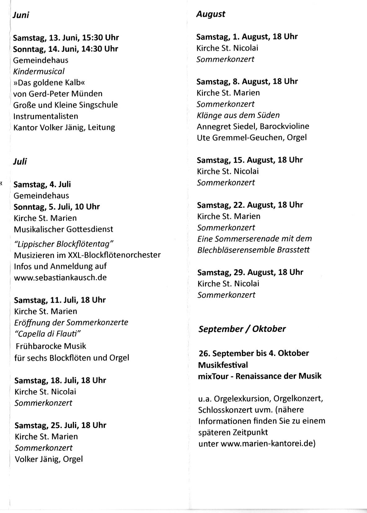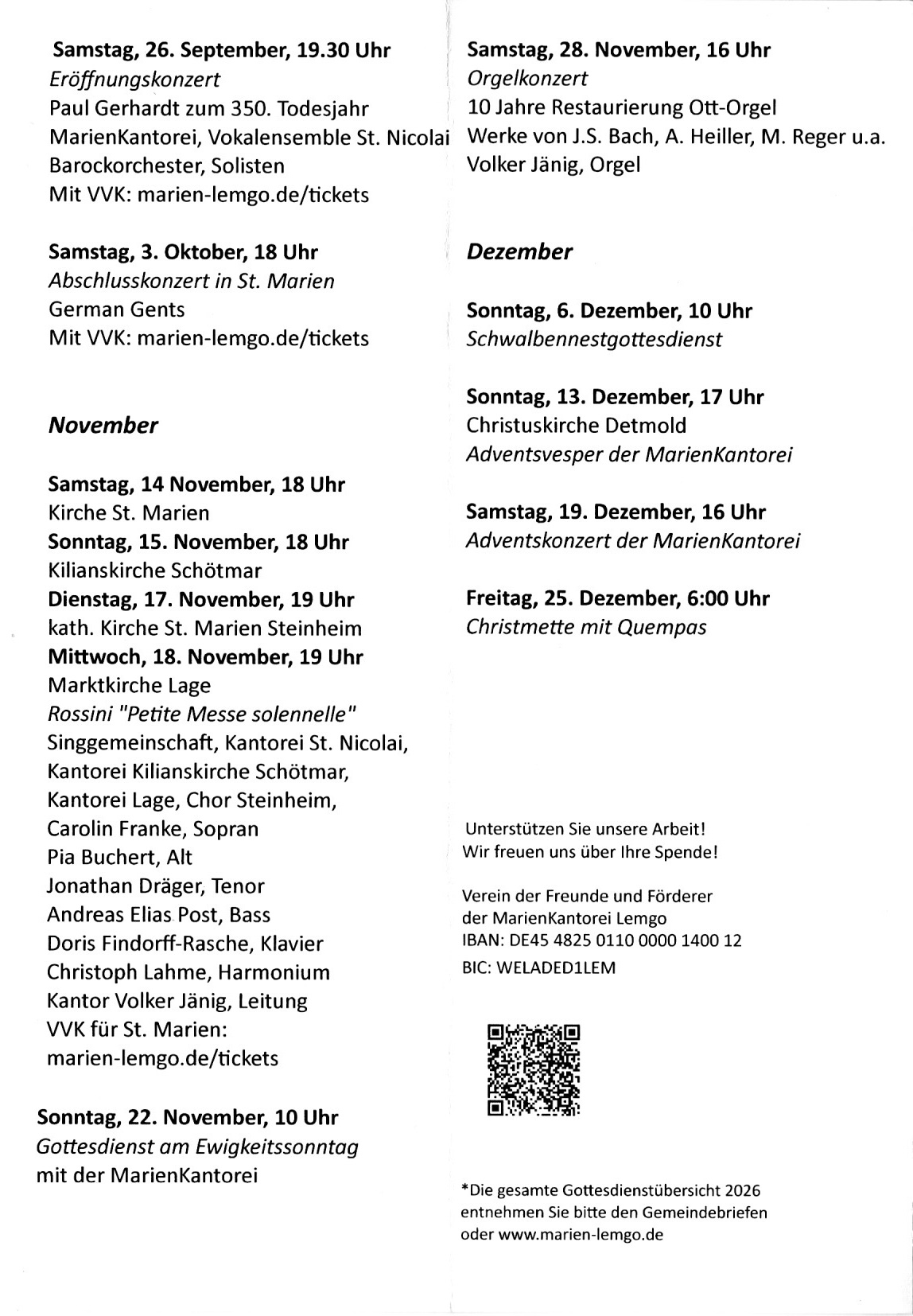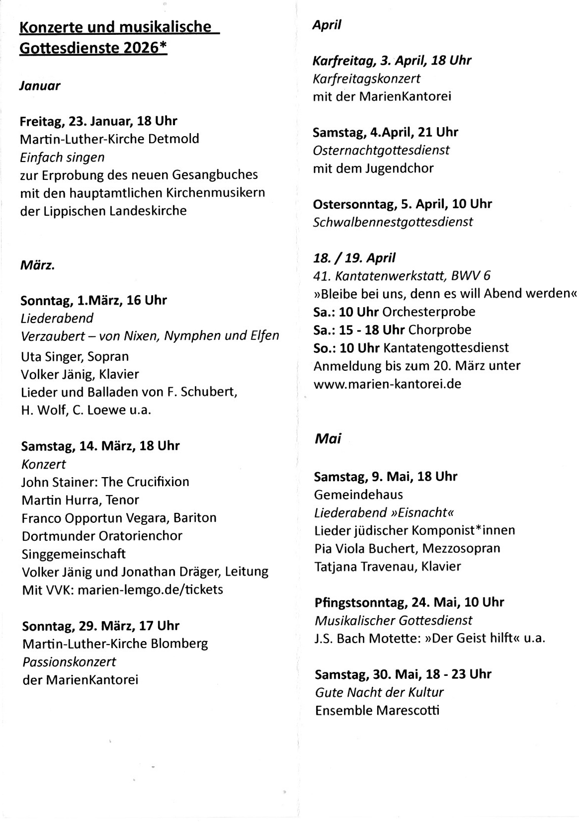 Des weiteren sind die Chöre der MarienKantorei Lemgo in den Gottesdiensten in der Kirche St. Marien zu hören. Die Termine finden sie auf unserer „Home“-Seite oder der Seite der Gemeinde: