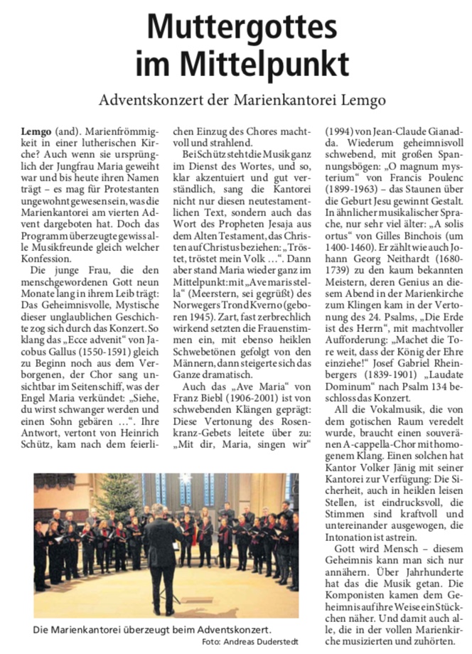 Hier finden Sie viele Presseartikel, die über Aktionen und Konzerte der MarienKantorei Lemgo berichtet haben, auch im Zusammenhang mit MarienKantorei übergreifenden Projekten.
